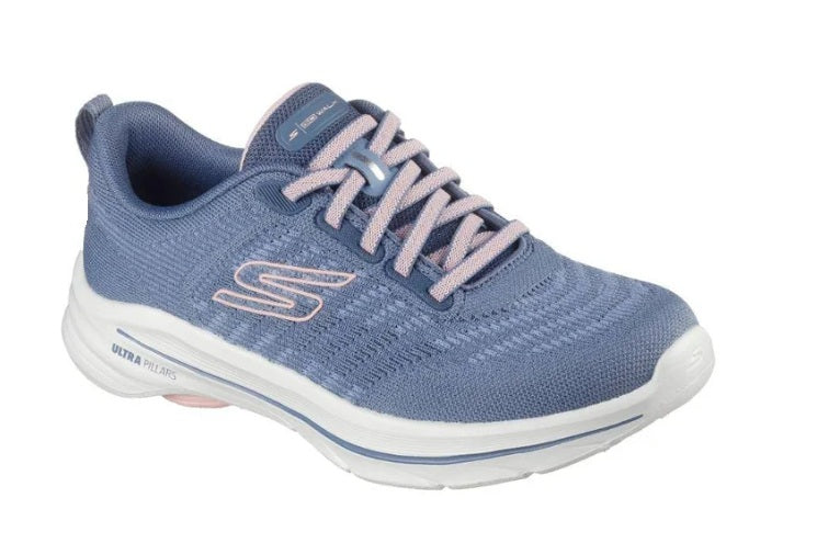 Put a stylish spring in your step with Skechers GO WALK™ 8 - Britt. This vegan walking style features a two-tone engineered knit upper with fixed stretch laces, a breathable Skechers Air-Cooled Goga Mat™ insole, lightweight ULTRA GO® midsole cushioning, high-rebound Ultra Pillars®, and Comfort Pillar Technology® for added support.