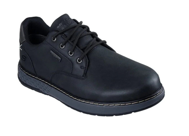Classic style and comfort arrives in Skechers Relaxed Fit®: Garlan - Pryor. Featuring a waterproof lace-up vegan leather upper with a charcoal-infused Air-Cooled Memory Foam® insole and Skechers Goga Mat Arch™ cushioning for added support.