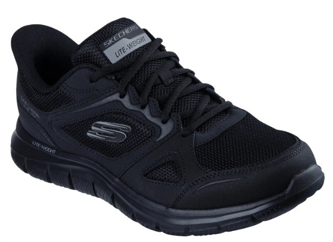 Train in lightweight comfort and sporty style wearing Skechers Hands Free Slip-ins®: Track - Ezral. Designed with our Heel Pillow®, this sleek style features a mesh upper with leather and synthetic overlays, adjustable laces, and a cushioned Skechers Air-Cooled Memory Foam® insole.