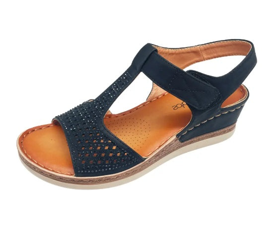 Slip into the Simona Ricci Sandal BARN this Summer for casual and comfy wear. Featuring a T-Bar laser cut pattern with matching diamante and velcro adjustment. With an extra padded cushion footbed on a low 60mm flexi wedge. The ultimate in simplicity and comfort.