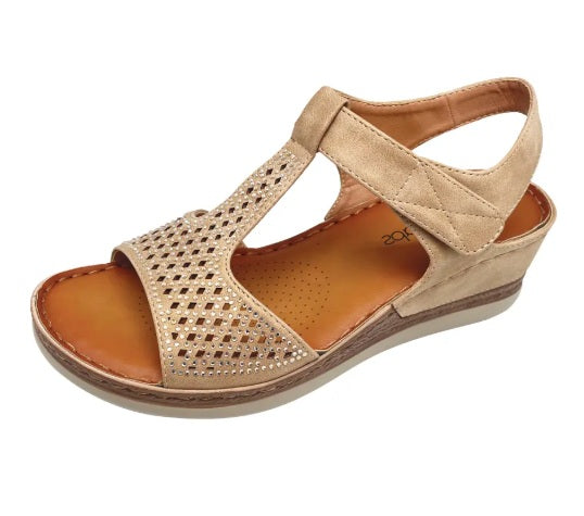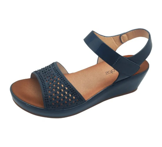 Dress to impress this Summer In Simona Ricci style BAYOU. It features a simple 2 strap design with the front strap a combination of laser cut design and matching diamantes. The backstrap is matching patent soft leather-like material with velcro for easy slip-on. Presented on a low 45mm low wedge with padded insole which allows you to wear this new stunning sandal all day. This style comes in Euro Sizing