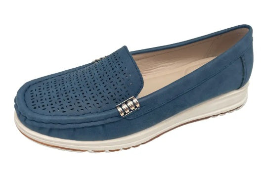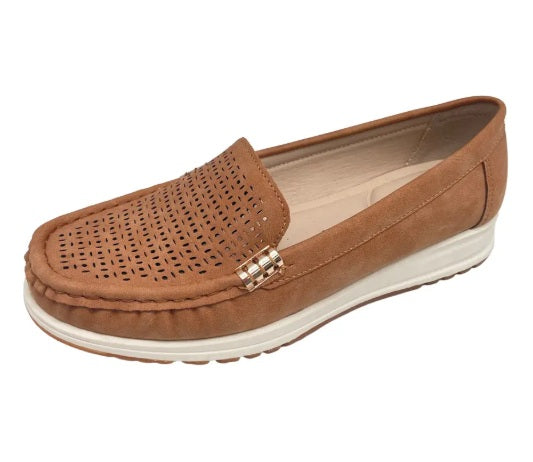 Slip into the Bare Traps new wedge moccasin BISCAY . It features a Nubuck feel material upper with lovely perforated pattern to the vamp. It is adorned with 2 x Gold trims to the upper. Lining is soft Natural PU and the sock is padded with memory foam. The shoe is made on a low (27mm) 2-colour rubber wedge. An ideal choice for all day wear.