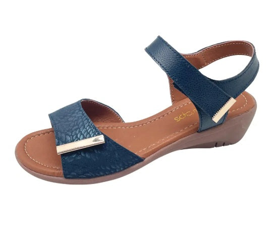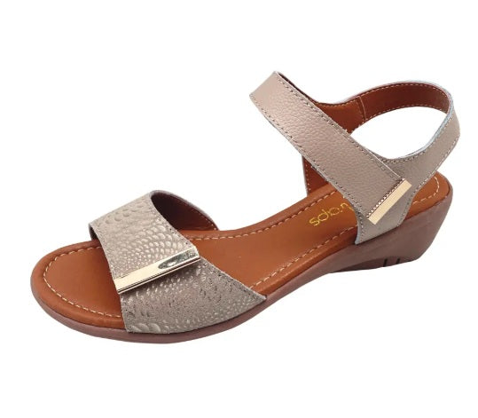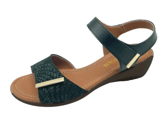 Bare Traps leather sandal CASINI features an embossed vamp and matching leather backstrap. The straps are finished off with gold trim and are velcroed for easy adjusting. The padded insole sits on a low 40mm rubber lightweight wedge. Perfect for everyday comfort.