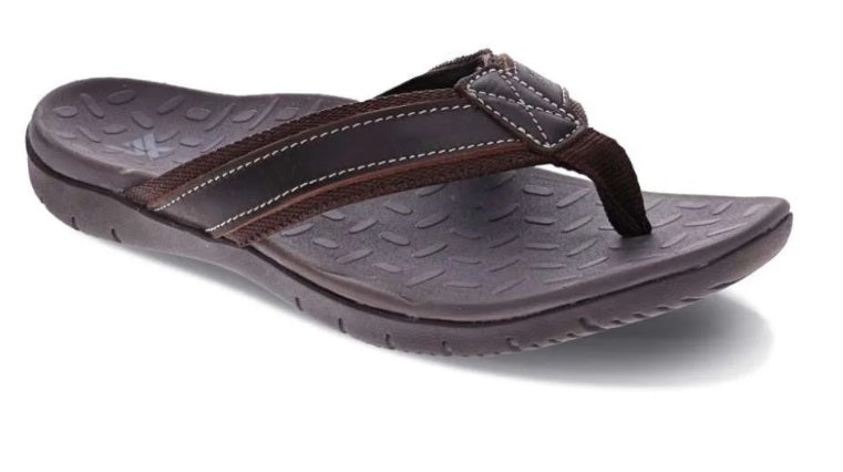 This everyday thong features a leather and webbing upper with a detailed crossed stitched front panel. The EVA footbed incorporating biomechanical technology gives you all day comfort and support.
