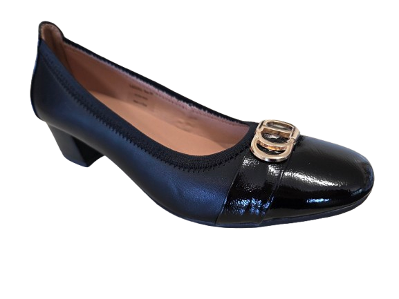 Laguana by Simona Ricci is a stylish block heeled slip on shoe with patent toe cap and lovely metallic embellishment.